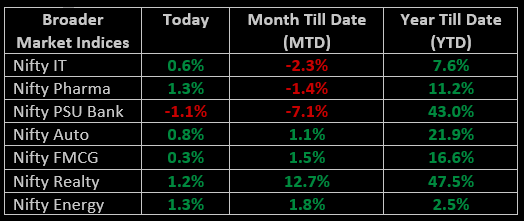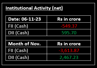 On November 6, the Indian market continued its upward trend for the third consecutive session. Starting with a gap-up, the indices saw sustained gains throughout the day, and in the final trading hour, Nifty surpassed 19,400. The positive momentum was widespread across sectors, except for PSU Banks, which experienced a 1% decline. All other sectoral indices closed in positive territory, with pharma, capital goods, metal, oil & gas, power, and realty each gaining 1%.