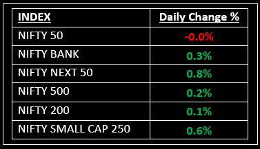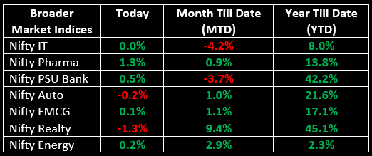 On November 7, the Indian equity indices faced a marginal dip in a session characterized by volatility, after enjoying three consecutive positive trading sessions. The market maintained a rangebound trajectory throughout the day. Top Gainer: Sun Pharma | Top Loser: Hero Moto Co
