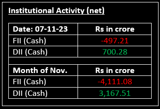 On November 7, the Indian equity indices faced a marginal dip in a session characterized by volatility, after enjoying three consecutive positive trading sessions. Despite an initial lower start influenced by mixed global cues, the market maintained a rangebound trajectory throughout the day. However, a last-hour surge in buying activity managed to offset some of the losses, resulting in a flat closure. In terms of sectoral performance, healthcare and oil & gas witnessed a 1% rise each while realty experienced a 1% decline.