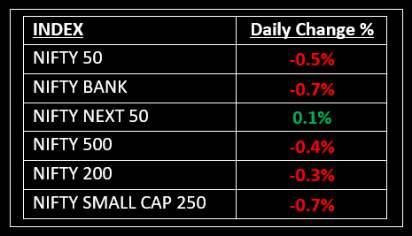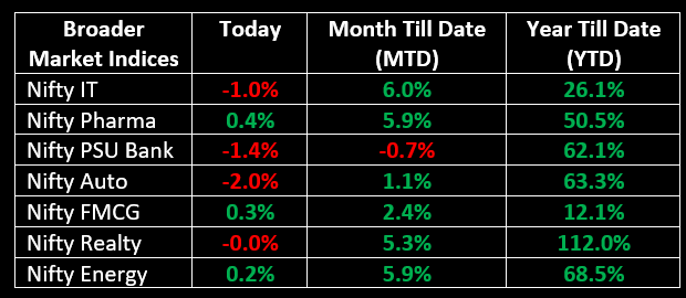 Among sectoral indices, the Nifty Auto index led losses, falling 2%, followed by the Nifty Metal and PSU Bank indices, which declined by 1.6% and 1.4%, respectively. The Nifty IT index was down 1%, while the Nifty Bank index slipped by 0.7%.
