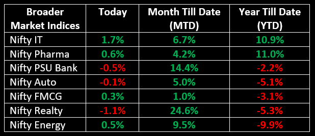 Sector-wise, the performance was mixed. Realty led the decline, dropping 1.14%, while the banking sectors also faced losses, with PSU Banks falling 0.52% and Private Banks down by 0.17%. Financial Services slipped 0.47%. On the flip side, IT and Media sectors stood out, posting healthy gains of 1.67% and 1.09%, respectively.