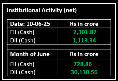 On June 10, the market struggled to maintain early gains and ended flat after a volatile session, as profit booking set in following recent advances. With most positive factors already priced in, investor attention now shifts to the US-China trade talks and inflation data for both the US and India, set to be released this week.