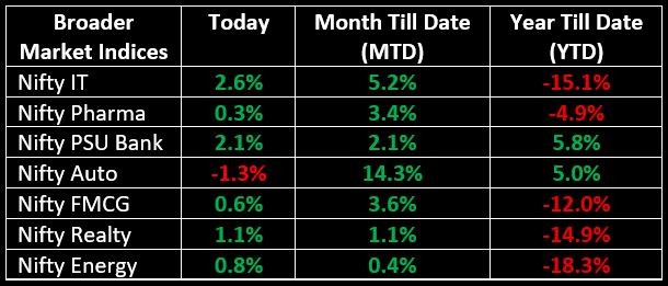 Among the broader indices, the BSE Midcap index rose 0.8% and the BSE Smallcap index advanced 0.7%. On the sectoral front, IT, PSU Bank and Realty gained between 1% and 2.6%, while Auto fell by 1% and Media slipped by 0.6%.