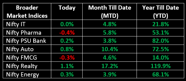 All sectoral indices were mixed in today's session, with the Realty index gaining over 1%. The Nifty Auto index also contributed to the gains, rising nearly 1%. The oil and gas index, industrials, and capital goods recorded gains of up to 2%.
