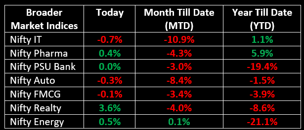On March 11, Indian equity indices ended on a flat note after a volatile session. On the back of negative global cues, the indices opened weak, with the Nifty slipping below 22,350, dragged down by banking stocks, including IndusInd Bank, which fell 10% in early trade. However, the Nifty saw a sharp recovery from the day's low to close with marginal gains.