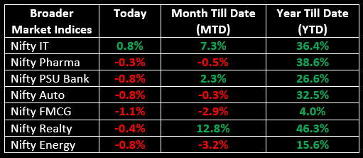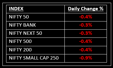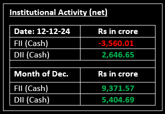 On December 12, the Indian benchmark indices ended lower amid selling across most sectors, ahead of the retail inflation data and Friday's WPI inflation report. Despite positive global cues, the Indian market opened lower but erased initial losses and remained flat during the first half. However, profit-booking in the second half led to a decline, as selling pressure was witnessed across most sectors, except for IT & Metal. All sectoral indices ended in the red, with the Media index down 2% and the FMCG index shedding 1%.