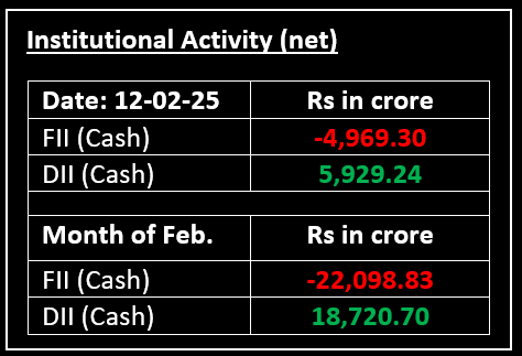 On February 12, Indian equity indices extended their losing streak for the sixth consecutive session, ending marginally lower after failing to sustain a sharp mid-session recovery. Investor sentiment remained cautious amid concerns over the global trade war and upcoming US inflation data. Among sectors, most ended in the red, with the realty index down nearly 3%, while PSU Bank and metal were the only gainers.