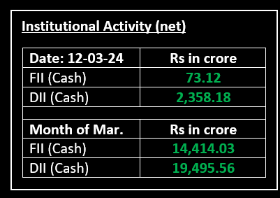 On March 12, in another session marked by volatility, the Indian benchmark indices closed flat, with the Nifty ending at 22,335.70. Commencing with a flat to positive opening, the market saw an extension of gains as the day progressed. However, profit-booking ensued amidst broad-based selling across various sectors. On the sectoral front, with the exception of IT, all other indices concluded in negative territory, with the realty index declining by nearly 3.5%, PSU Bank and Media indices falling by 2% each, and capital goods, FMCG, healthcare, metal, and power indices experiencing a 1% decline each.