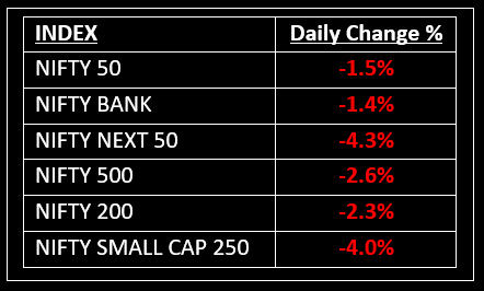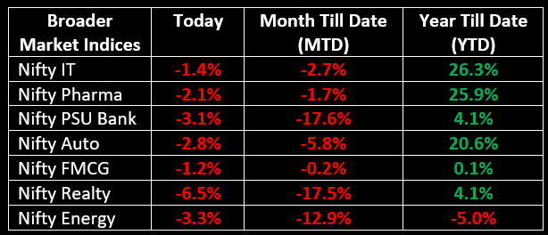 Sectorally, all indices closed in the red, with the realty index falling 6.7% and oil & gas, power, PSU, metal, and media sectors declining by 3-4%.