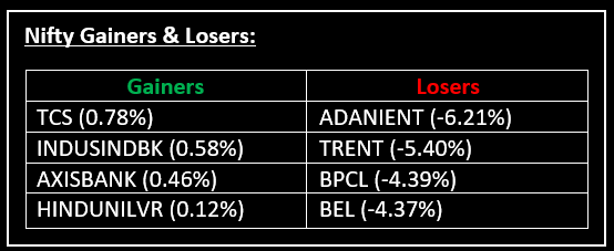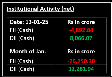 On January 13, Indian benchmark indices declined for the fourth consecutive session, pressured by broad-based selling, rising crude oil prices to a 3-month high, and weak global cues as investors lowered their expectations for a US rate cut in 2025. Top Gainer: TCS | Top Loser: ADANIENT
