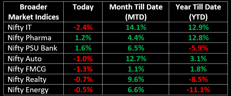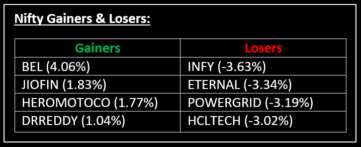 Sector performance was mixed. Capital goods, media, PSU Bank and pharma sectors saw gains between 1-1.6%, while IT, metal, FMCG, oil & gas and realty sectors faced declines ranging from 0.9-2.5%.