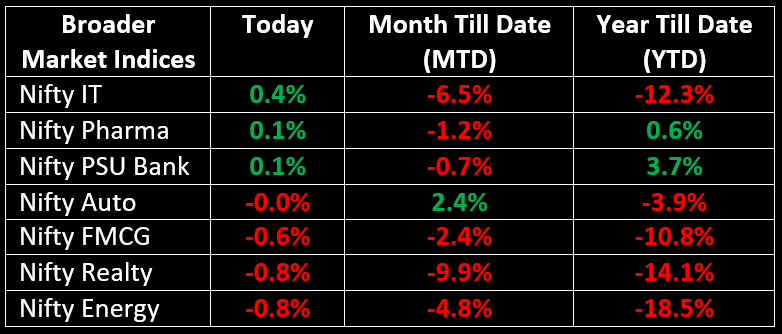 Among broader indices, the BSE midcap index was down by 0.2%, while the BSE Smallcap index shed 0.6%. Sector-wise, FMCG, realty, oil & gas and metal sectors dropped by 0.6% to 1.4%, while Financial Services, Consumer Durables and IT sectors saw gains between 0.4% and 0.75%.