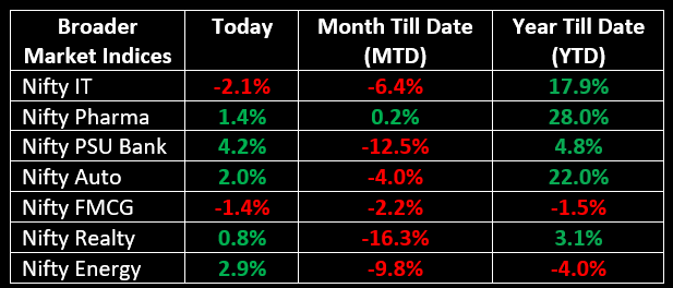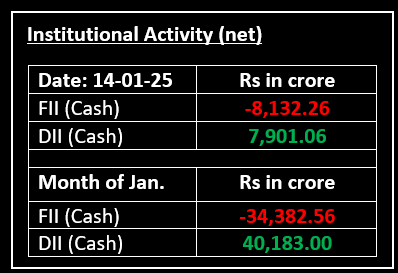 On January 14, the Indian equity indices ended higher, snapping a four-day losing streak as buying interest emerged across most sectors. After four consecutive sessions of selling pressure that pushed the indices to a seven-month low, the markets staged a notable rebound. While most sectoral indices closed in the green, IT and FMCG remained under pressure, declining by 2% and 1.4%, respectively.