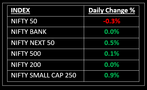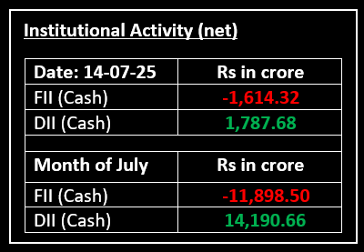 On July 14, benchmark indices closed lower for the fourth consecutive day, as tariff tensions weighed on market sentiment. However, the Nifty 50 managed to hold above the 25,000 mark and broader markets closed with gains with the BSE Midcap and Smallcap indices rising by 0.7% and 0.6%, respectively.