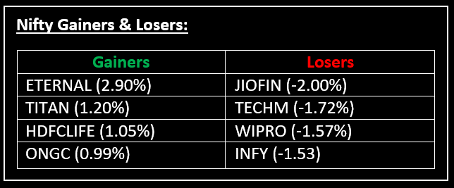 On July 14, benchmark indices closed lower for the fourth consecutive day, as tariff tensions weighed on market sentiment. Top Gainer: ETERNAL | Top Loser: JIOFIN