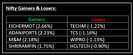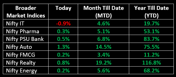 Nifty Auto outperformed the sectoral indices, rising 1.3%, led by M&M, Bharat Forge, and Tata Motors. Meanwhile, Nifty IT was the worst hit among the 13 sectoral indices, falling nearly 1%.