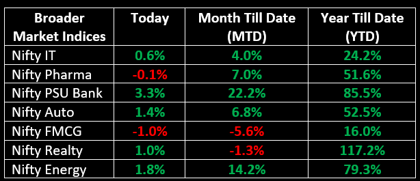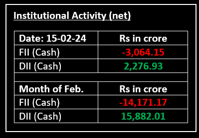 On February 15, amidst another volatile session, the market concluded with gains, extending its winning streak for the third consecutive session, with the Nifty crossing 21,900. Benefitting from positive global cues, Indian equity indices opened higher but erased some of the early gains to trade within a narrow range during the first half. However, they regained momentum in the latter half, closing near the day's peak levels. On the sectoral front, the FMCG index experienced a decline of 0.9%, while auto, PSU Bank, metal, realty, power, and oil & gas sectors saw gains ranging between 1% to 2%.
