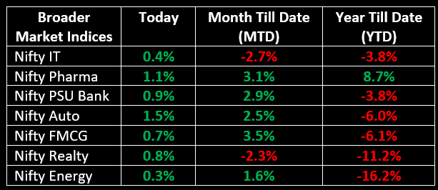 All sectoral indices closed in the green, with Pharma, Auto, Media, PSU Banks, Consumer Durables and Realty sectors rising by 0.5-1.5%