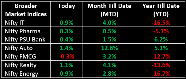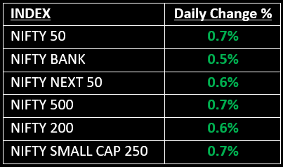 The broader indices mirrored the performance of the main indices, with the BSE Midcap and Smallcap indices both rising by 0.6%. All sectoral indices, except FMCG, closed in the green, with Auto and Realty sectors leading the way, both gaining 1%.