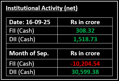 After a subdued previous session, the bulls made a strong comeback on September 16, propelling Nifty to reclaim the 25,200 level for the first time since August 23. This was driven by broad-based buying across sectors. The market opened positively and maintained an upward momentum for most of the session, with the rally strengthening towards the close, resulting in Nifty finishing at the highs of the day.