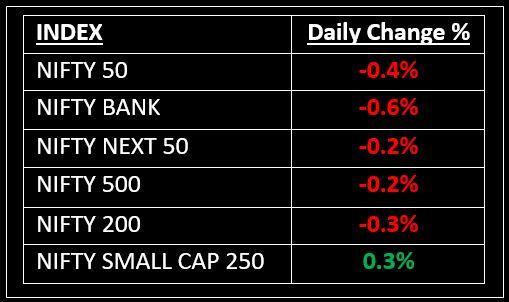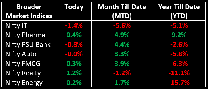 The broader market performed better than the main indices, with the BSE Mid-Cap index closing slightly higher and the Small-Cap index gaining 0.3%. Sector-wise, PSU Bank and IT stocks declined by 0.8% and 1.4%, respectively, while Metal, Consumer Durables and Realty indices saw gains of 0.5-1.2%.