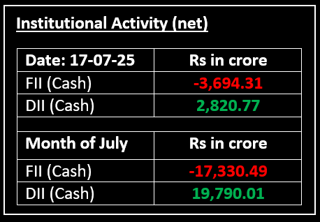 On July 17, benchmark indices reversed a two-day gain, wiping out most of the previous session's progress, due to selling pressure in IT and banking stocks following weak June quarter earnings. The markets struggled in the morning and despite a mid-session recovery, persistent selling in the final hour brought the Nifty index closer to the 25,100 level.