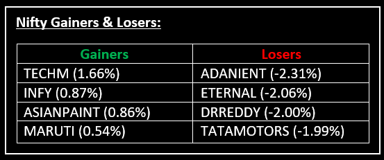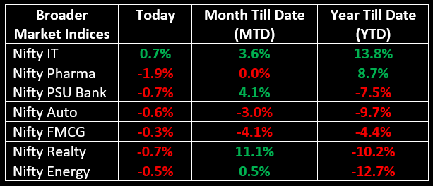 Among the sectors, Nifty IT bucked the trend, closing 0.7% higher, while other indices like Nifty PSU Bank, Nifty Oil & Gas, Nifty Auto and Nifty Realty saw losses ranging from 0.6% to 0.8%.