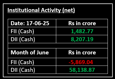 On June 17, Indian equities closed lower as ongoing tensions between Iran and Israel kept investor sentiment subdued. The two nations continued their exchange of attacks for the fifth consecutive day, contributing to a risk-off mood in the markets. Investors also remained cautious, awaiting key developments, including the U.S. Federal Reserve's policy decision scheduled for Wednesday.