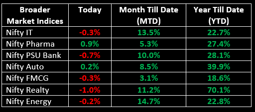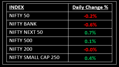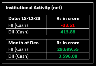 On December 18, the equity indices closed marginally lower after a volatile session, with Nifty hovering around 21,400. Starting the day on a negative note amidst mixed global cues, domestic indices staged a recovery in the initial hours, maintaining a flat trajectory for most of the first half. However, in the latter half, bears seized control, pushing the indices into the red. Noteworthy sector movements included a 1% gain in the Pharma index, a 0.7% rise in the Capital Goods index, a 1% dip in the Realty index, and a 0.5% decline in the Bank index.