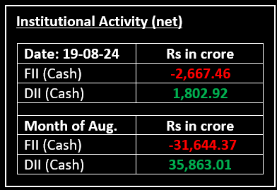 On August 19, Indian markets ended flat in a rangebound session. The Sensex dipped 12.16 points or 0.02% to close at 80,424.68 while the Nifty gained 31.50 points or 0.13% to settle at 24,572.70. The market opened higher, with Nifty above 24,600 amid positive global cues but lost momentum in the initial hour, trading rangebound for the remainder of the session.