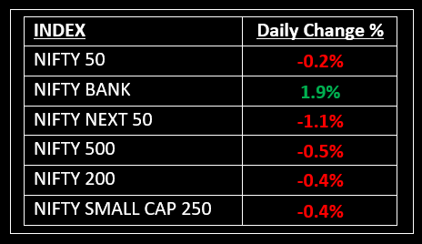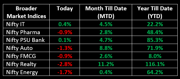 Despite positive global cues leading to a record-high opening, the indices erased all gains in the initial hours and oscillated between gains and losses throughout the session, finishing with marginal changes. While banking (up 2%) and IT (up 0.4%) sectors ended in the green, auto, capital goods, metal, oil & gas, power, and realty sectors fell 1-3%.