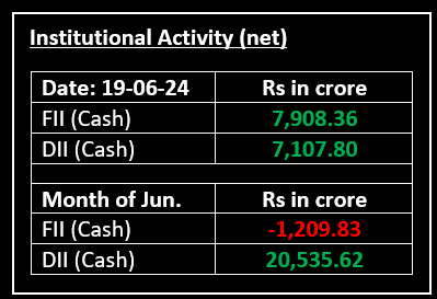 On June 19, Indian benchmark indices ended on a mixed note in a highly volatile session after hitting fresh all-time highs intraday. The Sensex rose 36.45 points or 0.05% to 77,337.59, while the Nifty slipped 41.90 points or 0.18% to 23,516.