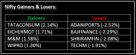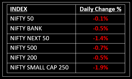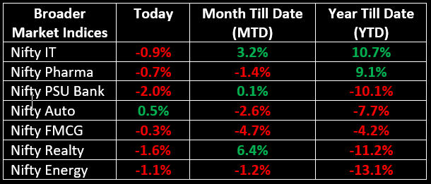Broader indices underperformed the main indices, with the BSE Midcap and Smallcap indices both falling over 1.6%. Among sectors, all but auto and consumption ended lower, with IT, media, metal, realty, oil & gas, pharma, telecom and PSU Bank witnessing declines of 0.5-2%.