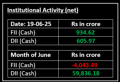 On June 19, Indian equity indices ended marginally lower in another volatile session, with the Nifty closing below 24,800 amid widespread selling across most sectors. After a flat-to-negative start, the market traded within a range throughout the day, reflecting mixed global cues following the US Fed’s decision to keep interest rates steady, while projecting higher inflation and slower growth. Rising geopolitical tensions in the Middle East further dampened investor sentiment.