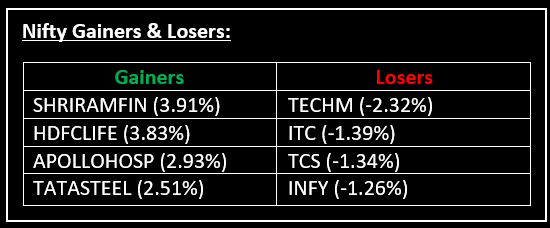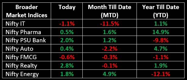 Except for IT and FMCG, all sectoral indices ended in the green, with Consumer Durables, Capital Goods, Realty, Oil & Gas, Media, Metal, Power, and PSU Bank rising 1-2.5%.