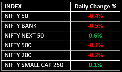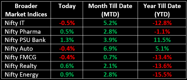 Among broader indices, the BSE Midcap index ended slightly lower, while the Smallcap index gained 0.2%. Sector-wise, consumer durables, media, auto, FMCG and IT sectors shed 0.4-0.65%, while pharma, realty and PSU banks rose between 0.5% to 1%.