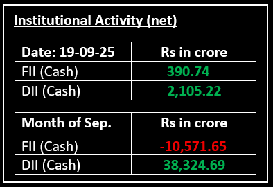 Indian equity markets snapped a three-day winning streak, ending lower on September 19. The Nifty 50 closed below 25,350, dragged down by selling in FMCG, IT and financial stocks. However, gains in realty, oil & gas and PSU banks helped limit the losses. After opening lower, the Nifty extended its fall, dipping below 25,300, but mid-day buying helped it recover from the lows.