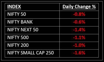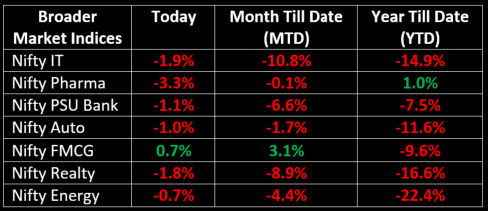Broader indices underperformed, with the BSE Midcap index down 1.4% and the Smallcap index lower by 1.6%. On the sectoral front, all sectors ended in the red except FMCG, which gained 0.7%.