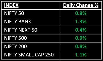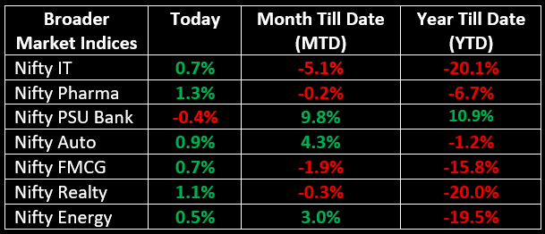 In the broader market, the BSE Midcap index gained 0.9% while the Smallcap index rose 1.2%. All sectors, except PSU Banks, ended in the green, with Private Banks, Realty, Pharma and Media sectors advancing by 1-4%.