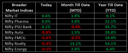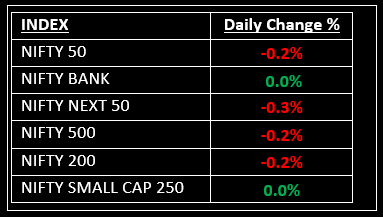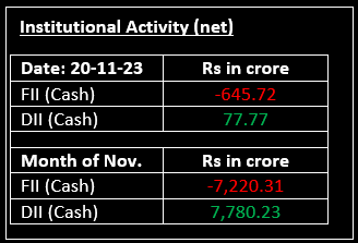 On November 20, the Indian benchmark indices concluded lower for the second consecutive session. The market commenced on a subdued note amid mixed global cues and remained rangebound throughout the day. The Nifty fell below 19,700 due to selling pressure in the auto, capital, and FMCG sectors. However, the day saw buying interest in IT and Healthcare names, helping to offset some of the intraday losses. Notably, the IT index recorded a 0.6% gain, while the healthcare index showed a 0.3% increase.