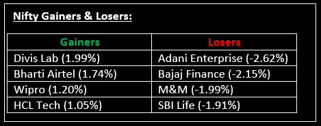 On November 20, the Indian benchmark indices concluded lower for the second consecutive session. The market commenced on a subdued note amid mixed global cues and remained rangebound throughout the day. The Nifty fell below 19,700. Top Gainer: Divis Lab | Top Loser: Adani Enterprise