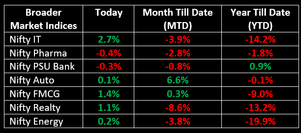 The broader indices also extended their gains for the third straight session, with the BSE Midcap and Smallcap indices adding 0.4% and 0.3%, respectively. Among sectors, FMCG, IT and realty rose by 1-2.7%, while the media index fell 2% and pharma and private banks dropped 0.4% each.