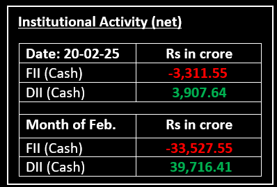 On February 20, Indian markets closed lower for the third consecutive session, though Nifty managed to hold just above 22,900. Broader market buying helped recover intraday losses despite selling pressure across most sectors. Among sectoral performers, auto, metal, oil & gas, media, power, realty, and PSU banks gained 1-2%, while the banking index declined by 0.5%.