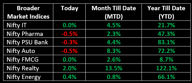 The broader market spectrum maintained a bullish stance, with the advance-decline ratio favouring the bulls. Meanwhile, the India VIX, the fear gauge, fell 2.68% to 13.34 levels, after rising in the previous couple of sessions.