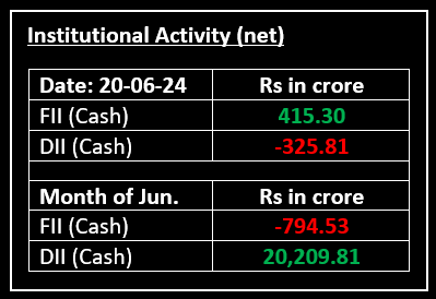 On June 20, the Indian equity market closed on a positive note amid volatility, with the Nifty finishing above 23,550. Selling was seen in the auto, pharma, and PSU banks stocks, while buying was seen in the metal, capital goods, realty, and oil & gas sectors.