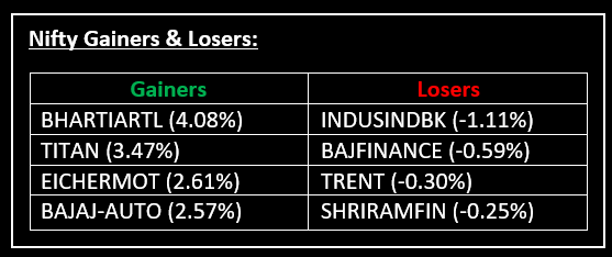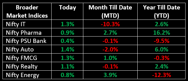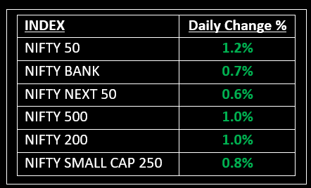 The Indian indices opened with a gap-up and continued to rise throughout the session. All sectoral indices closed in the green, with metal, media, IT, FMCG, auto, consumer durables, realty, and telecom each gaining around 1%.