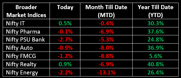 On the sectoral front, Energy, FMCG, Oil & Gas, PSU Bank, Media, Auto, and Metal indices declined 1–2%, reflecting widespread weakness. However, the Realty index rose by 1%, and the Information Technology index managed a modest gain of 0.5%, offering some support to the market.