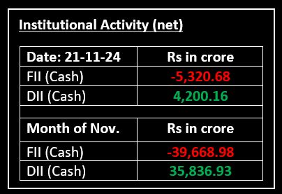 On November 21, Indian benchmark indices experienced a sharp decline, erasing the gains achieved in the previous session. The markets opened on a weak note due to unfavourable global cues and extended their losses throughout the day. Sentiment was further impacted by geopolitical tensions and heavy selling in Adani Group stocks following bribery allegations in a New York court.