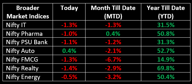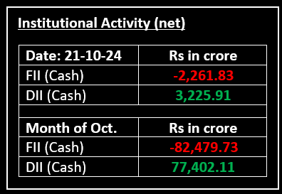 On October 21, following a smart recovery in the previous session, the market remained under pressure amid selling across most sectors, except auto. Backed by positive global cues, Indian indices opened on a strong note but erased all gains in the initial hour, trading flat in the first half. However, extreme volatility in the second half led to a close in the red, with Nifty falling below 24,750. Apart from auto, all other sectoral indices ended in the red, with FMCG, metal, capital goods, power, realty, IT, oil & gas, and media declining by 1-3%.
