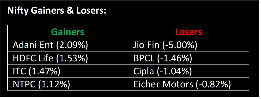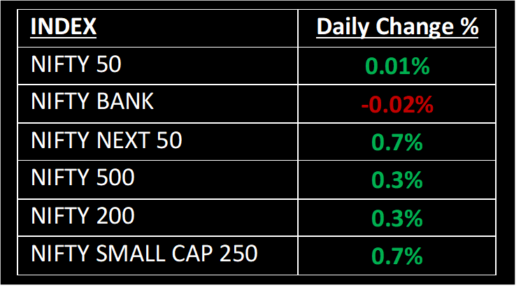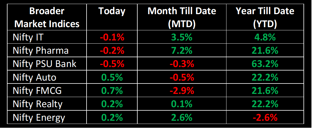 The markets closed marginally higher in an extremely rangebound session today. Traders chose a cautious approach, opting to observe from the sidelines following a period of turbulent trading in the preceding week. Amidst the constrained movement, there was noticeable interest in purchasing power and capital goods stocks. Conversely, Indian IT stocks underperformed even though the tech-centric Nasdaq saw a notable rise in the previous trading session.